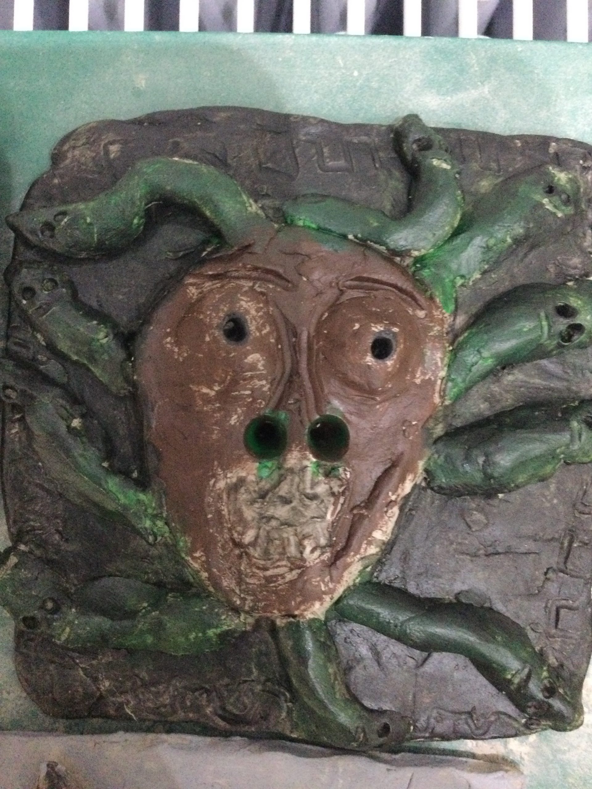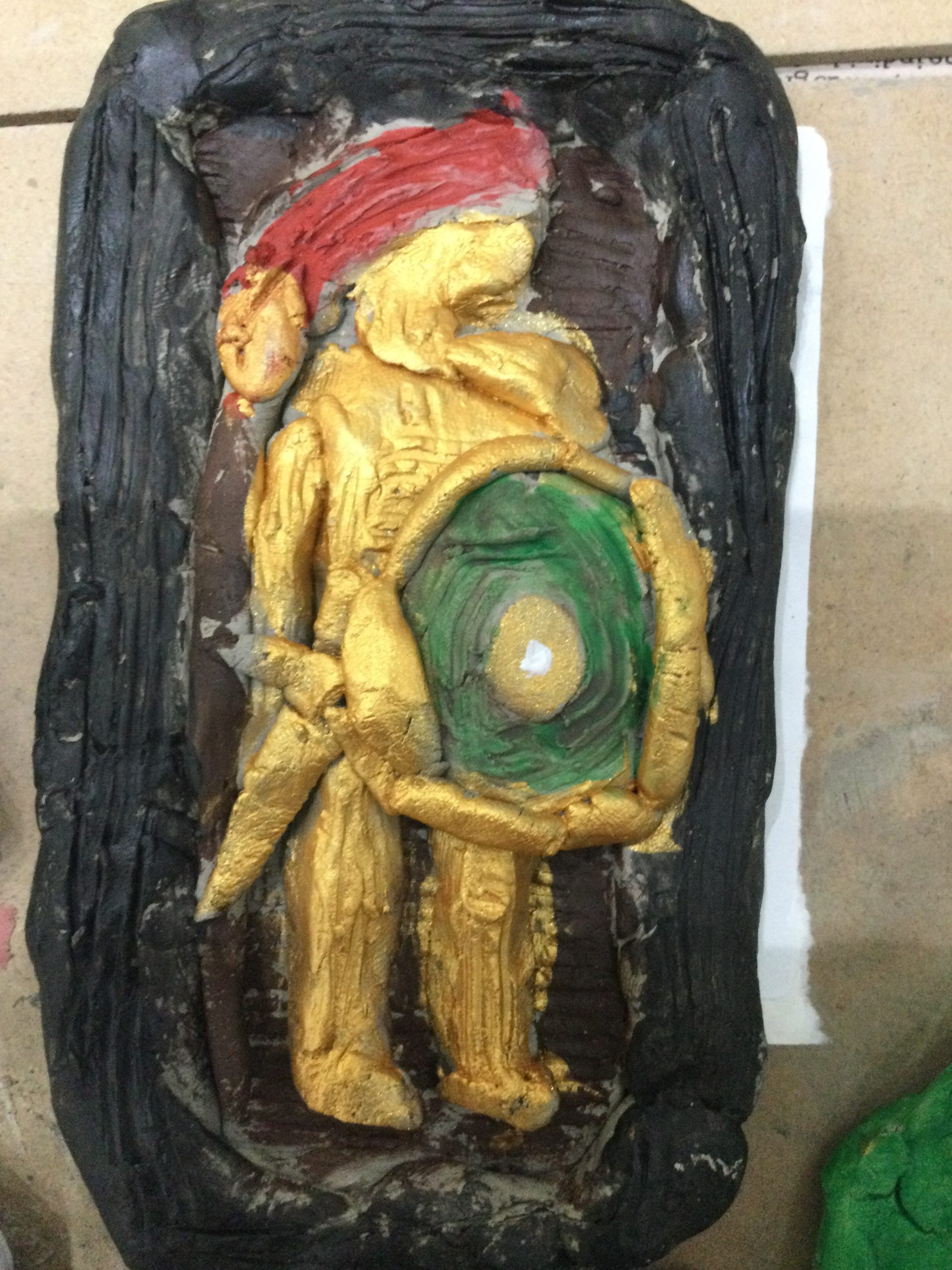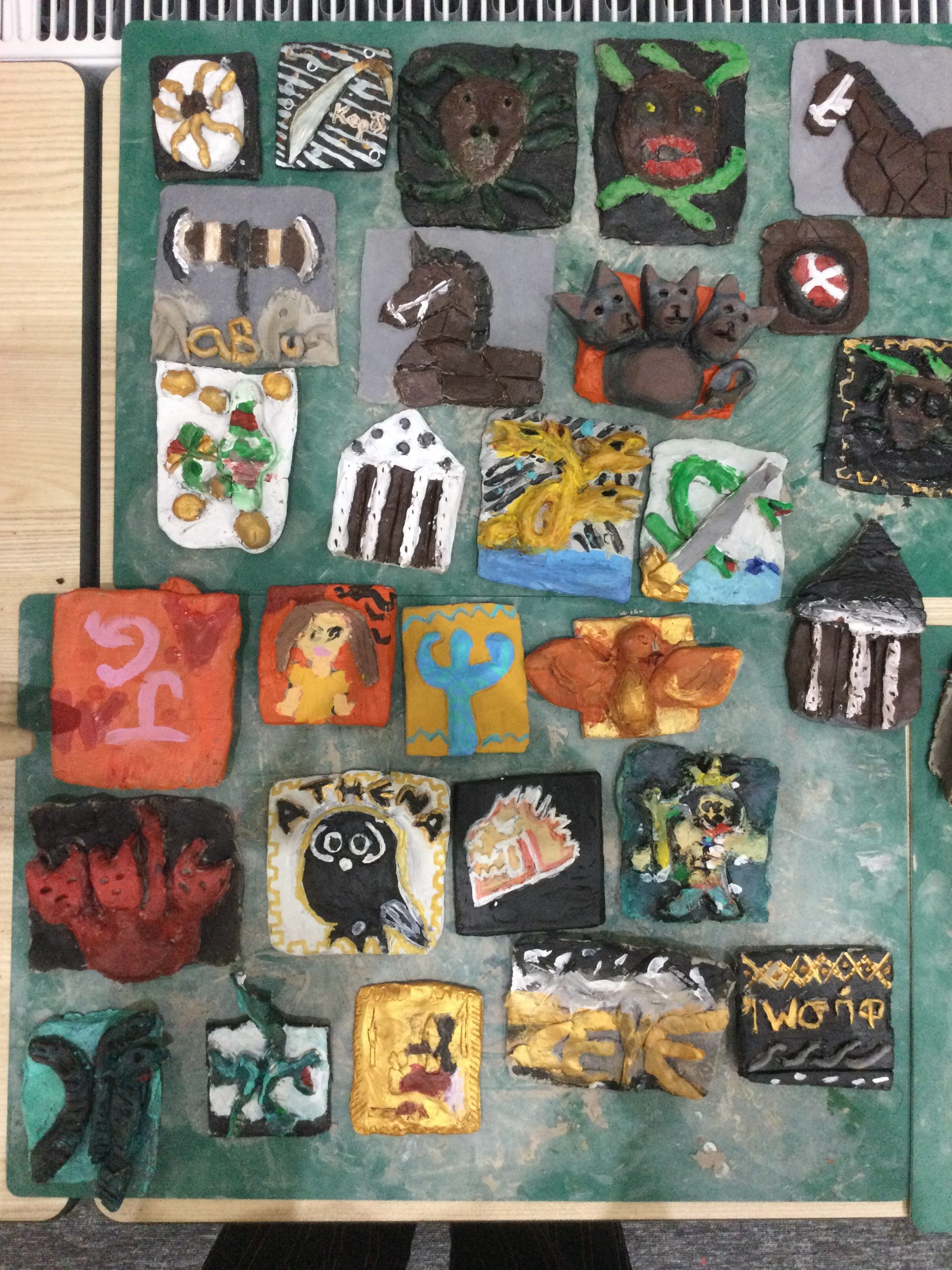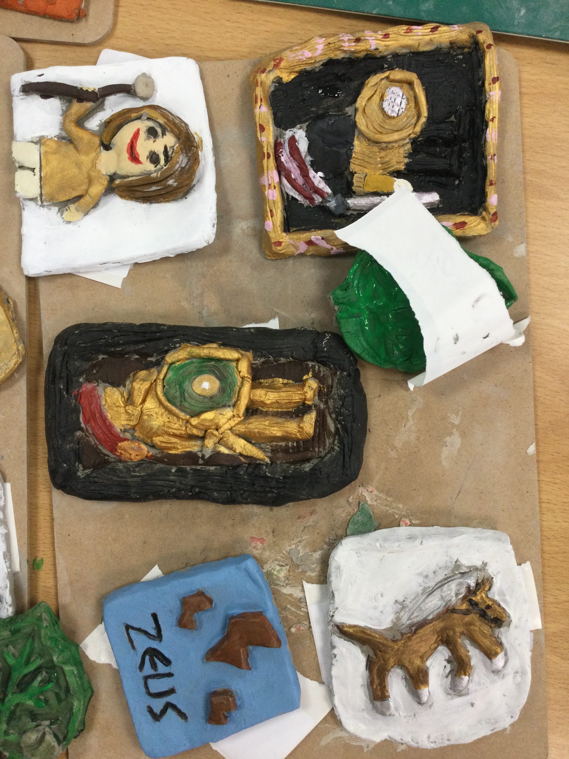 After designing our tiles, we made them out of clay and added the finishing touches of paint/colour today. Can you recognise some famous characters? Odysseus? Athena? Hera? Cerebus? Zeus? Medusa?