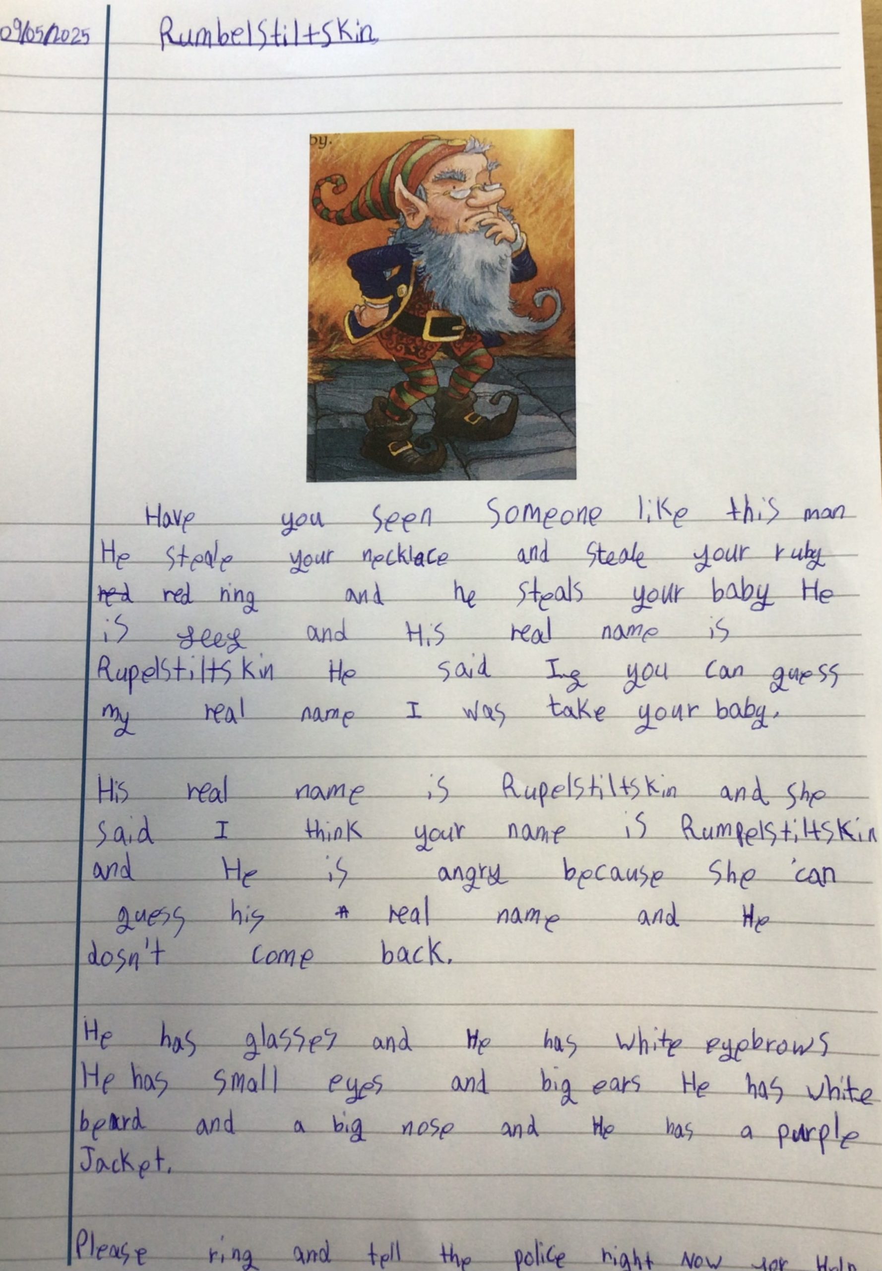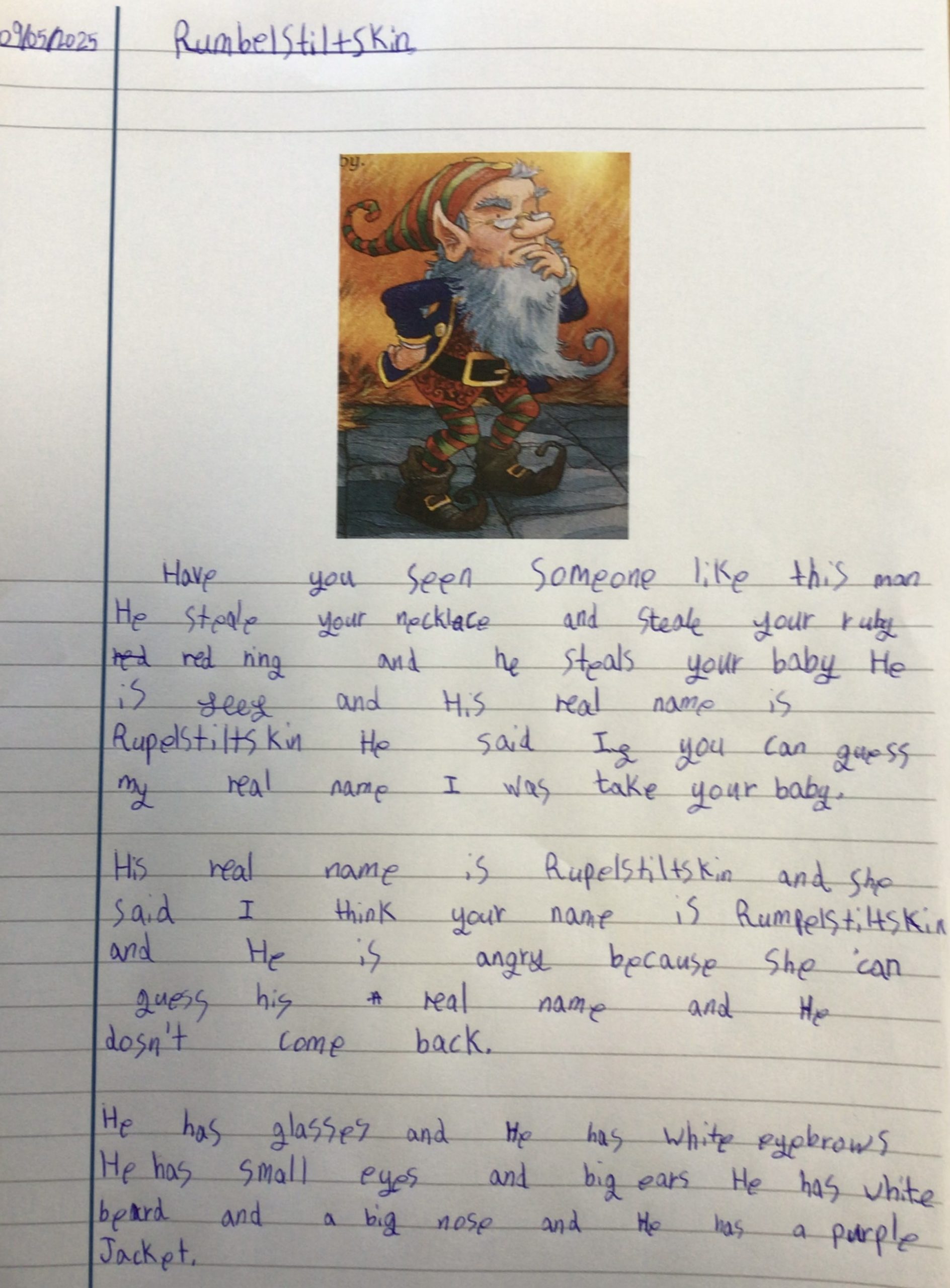 504We have been reading the story of Rumpelstiltskin. It is an old German fairy tale that was written many years ago. These children have worked so hard with their writing. I have been very impressed.