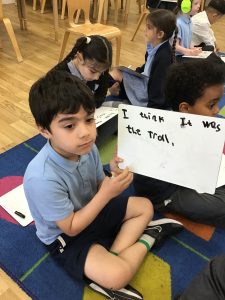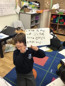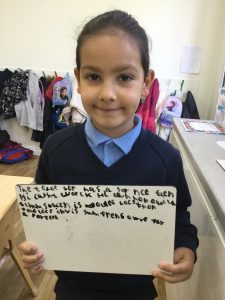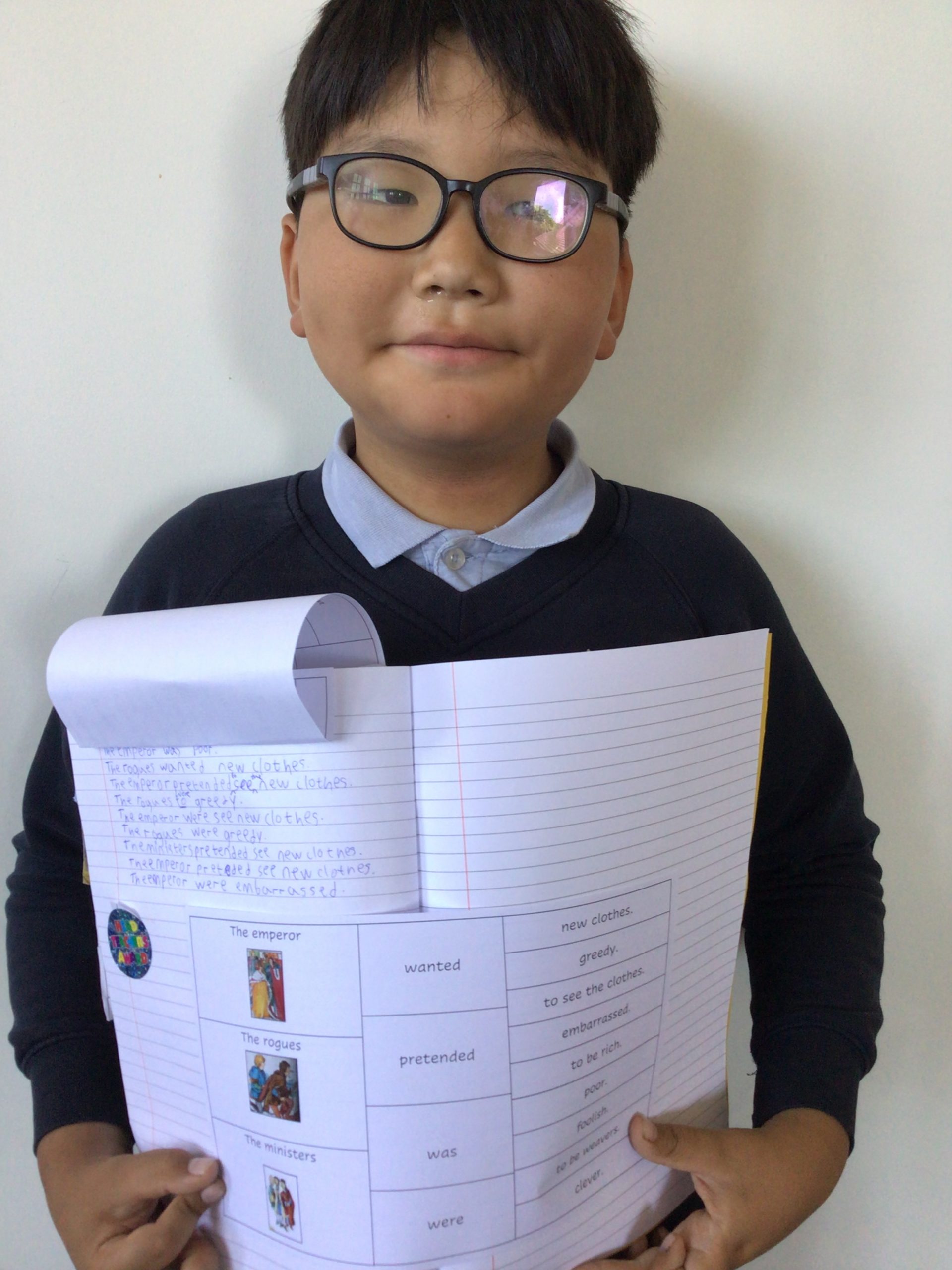 This boy created sentences about the story The Emperor’s New Clothes. A substitution table helped provide support to write different types of sentences. This story contains themes such as vanity and greed as well as humour. We’ve enjoyed reading it together.