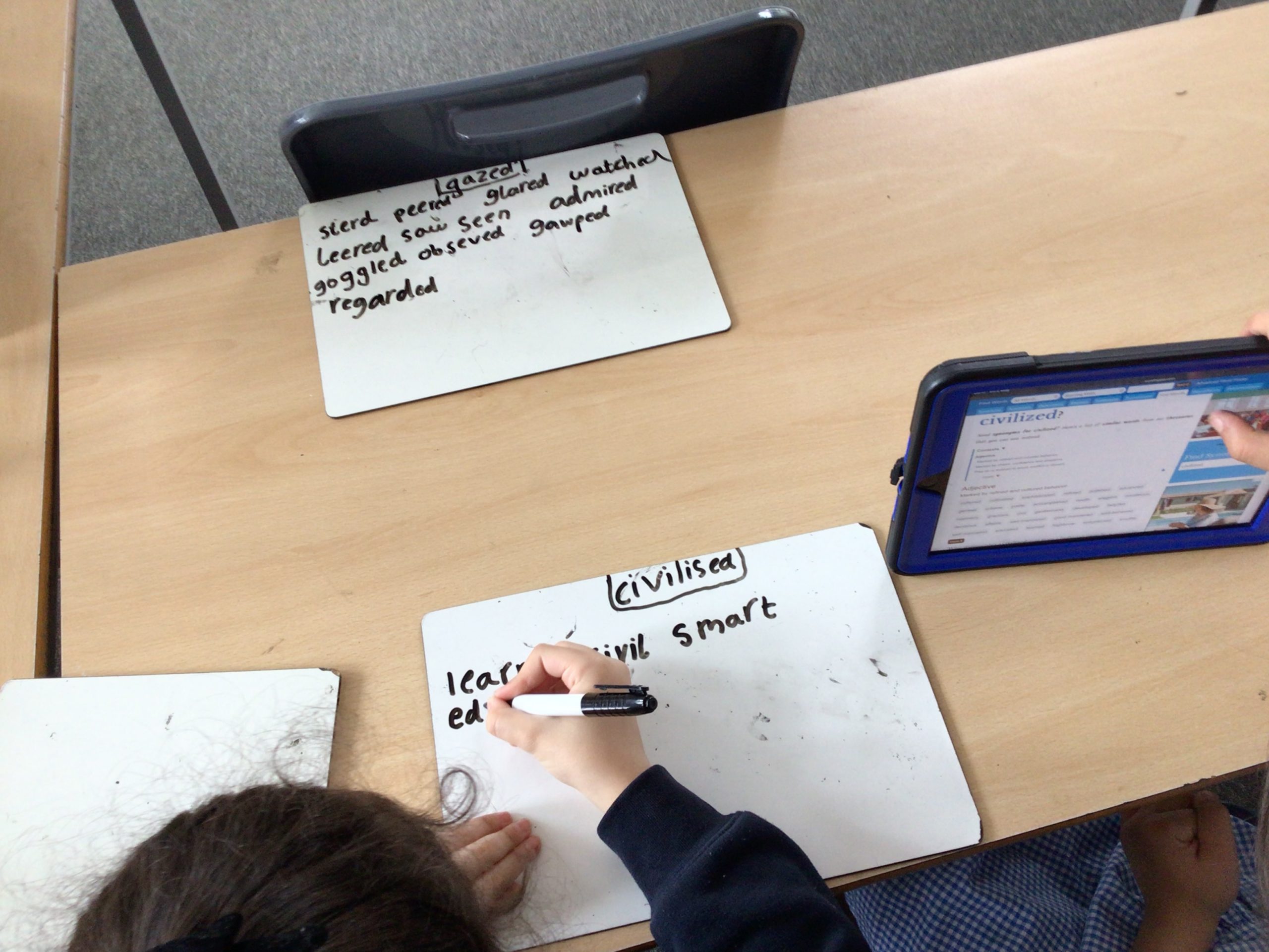 This morning we focused on synonyms for the 6 words we have been looking at in Jemmy Button – voyage, magnificent, civilised, year, gazed and savages. We then recorded the best alternative words to use in our future work.