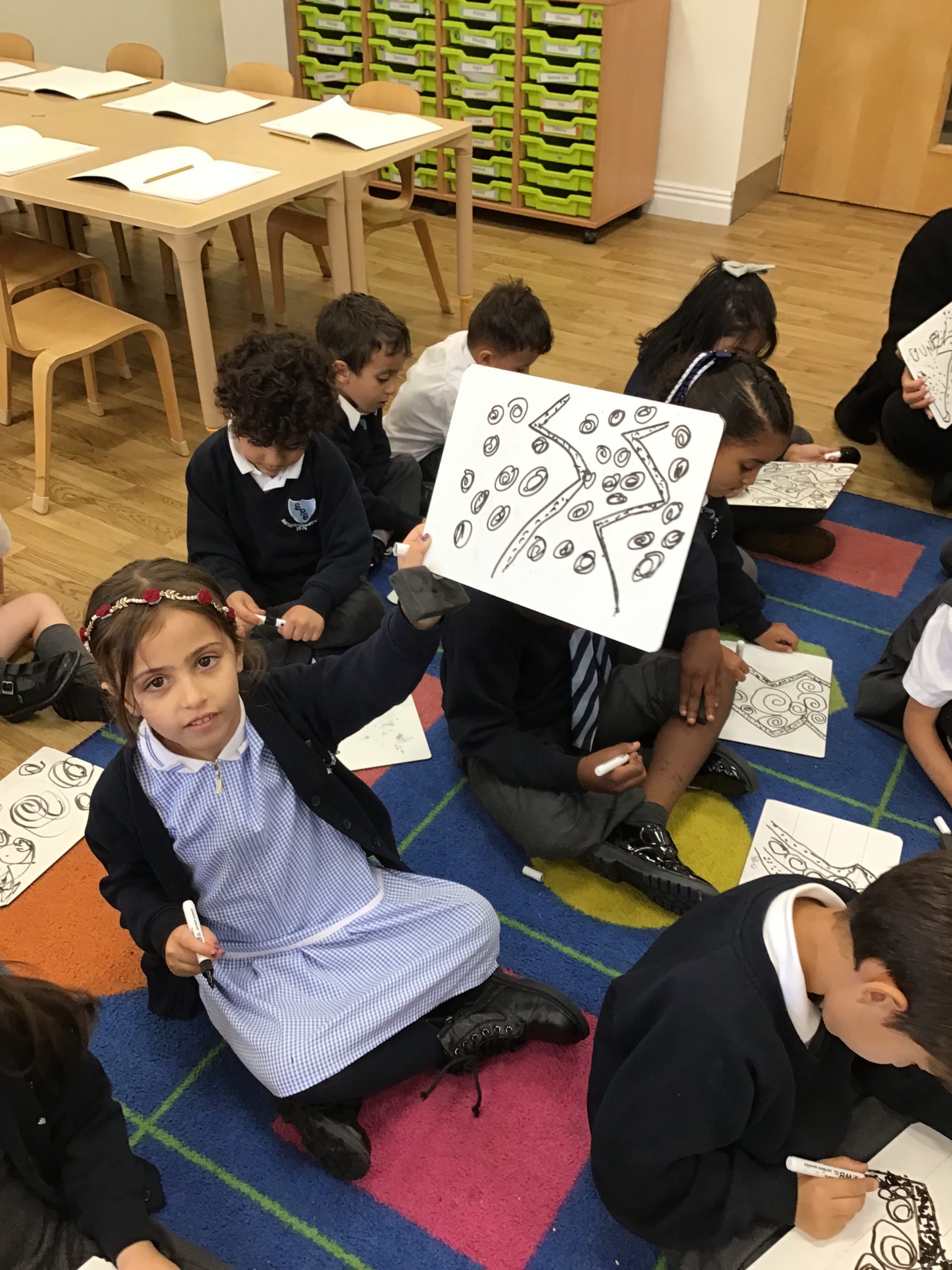We practised drawing artwork like Yinka Shonibare’s on our whiteboards today. Next week we will recreate this piece of art in our books using pencil and chalk.