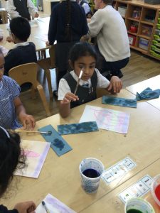Year 3 used a very old way of producing photographs without a camera. We used light sensitive paper to create a cyanotype capture. The children created their designs using natural resources found around schools – similar to Anna Atkins.