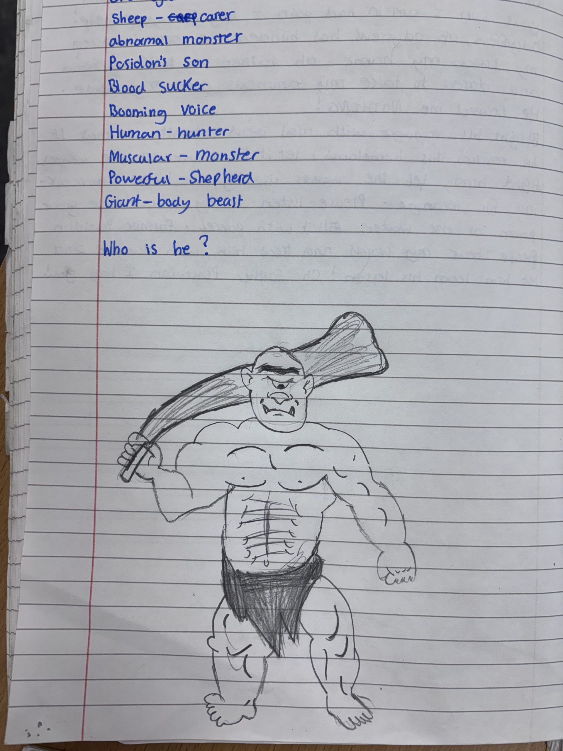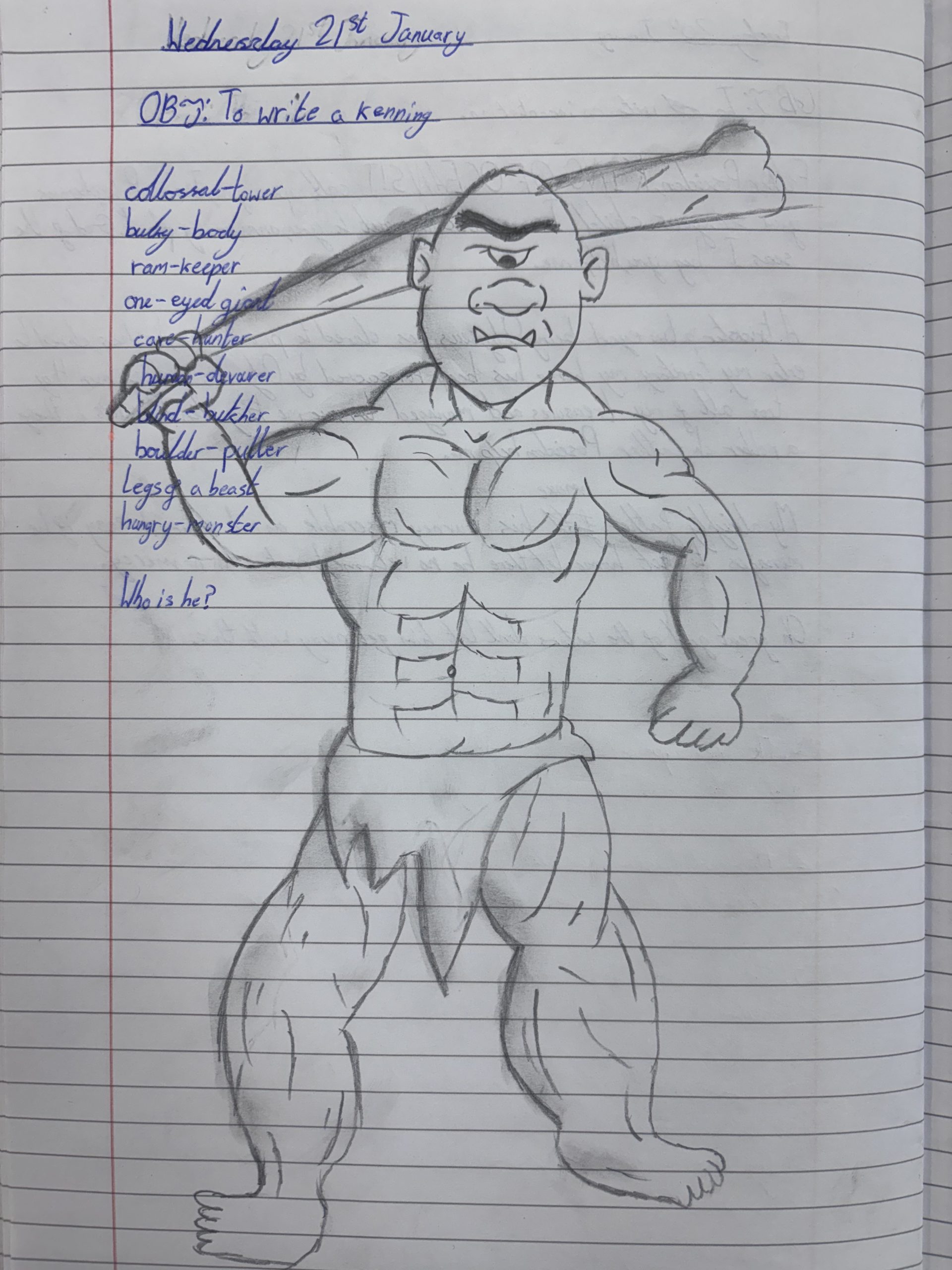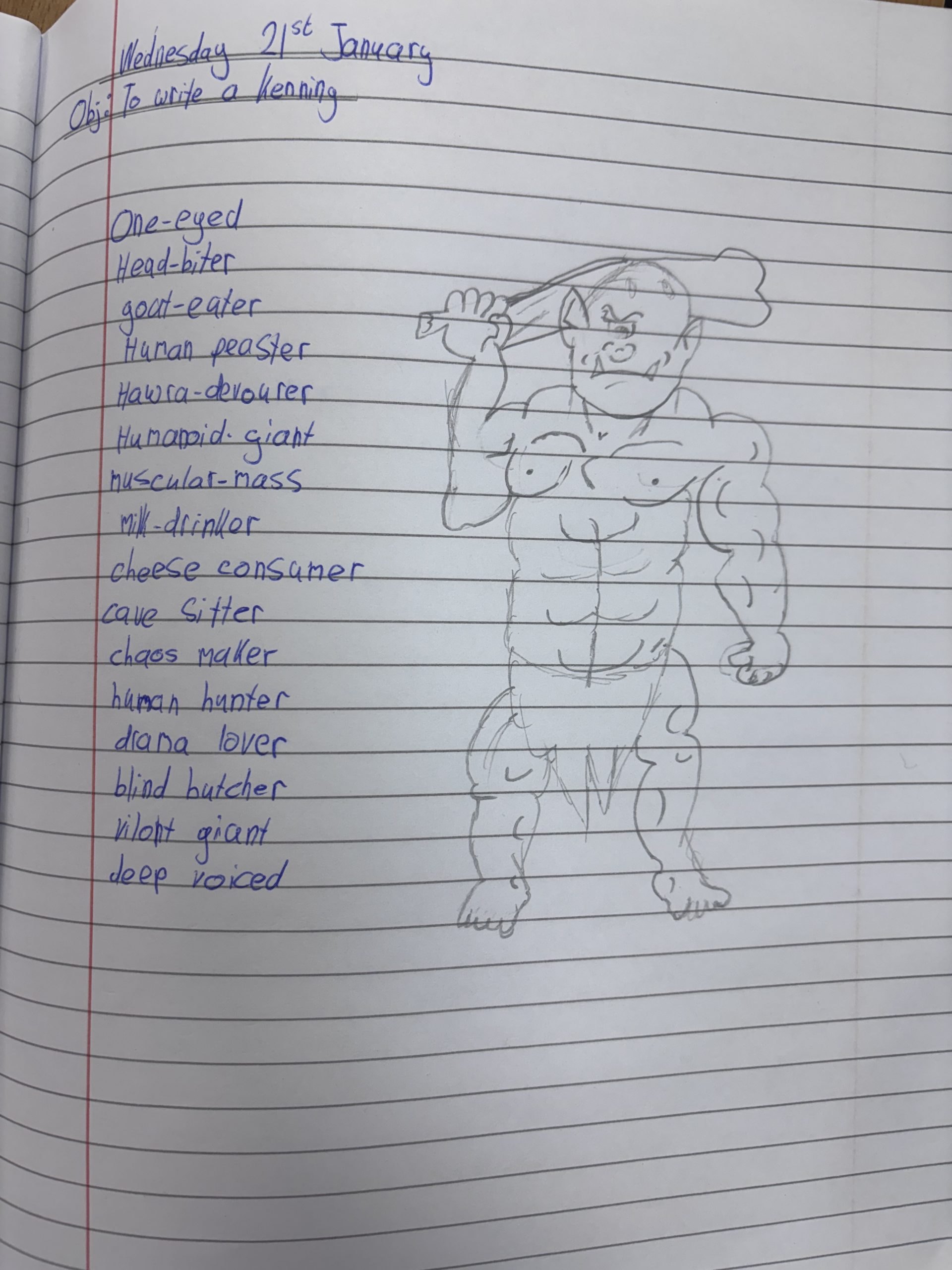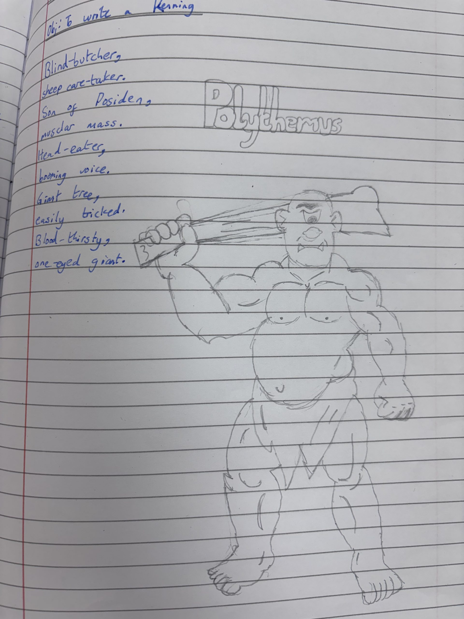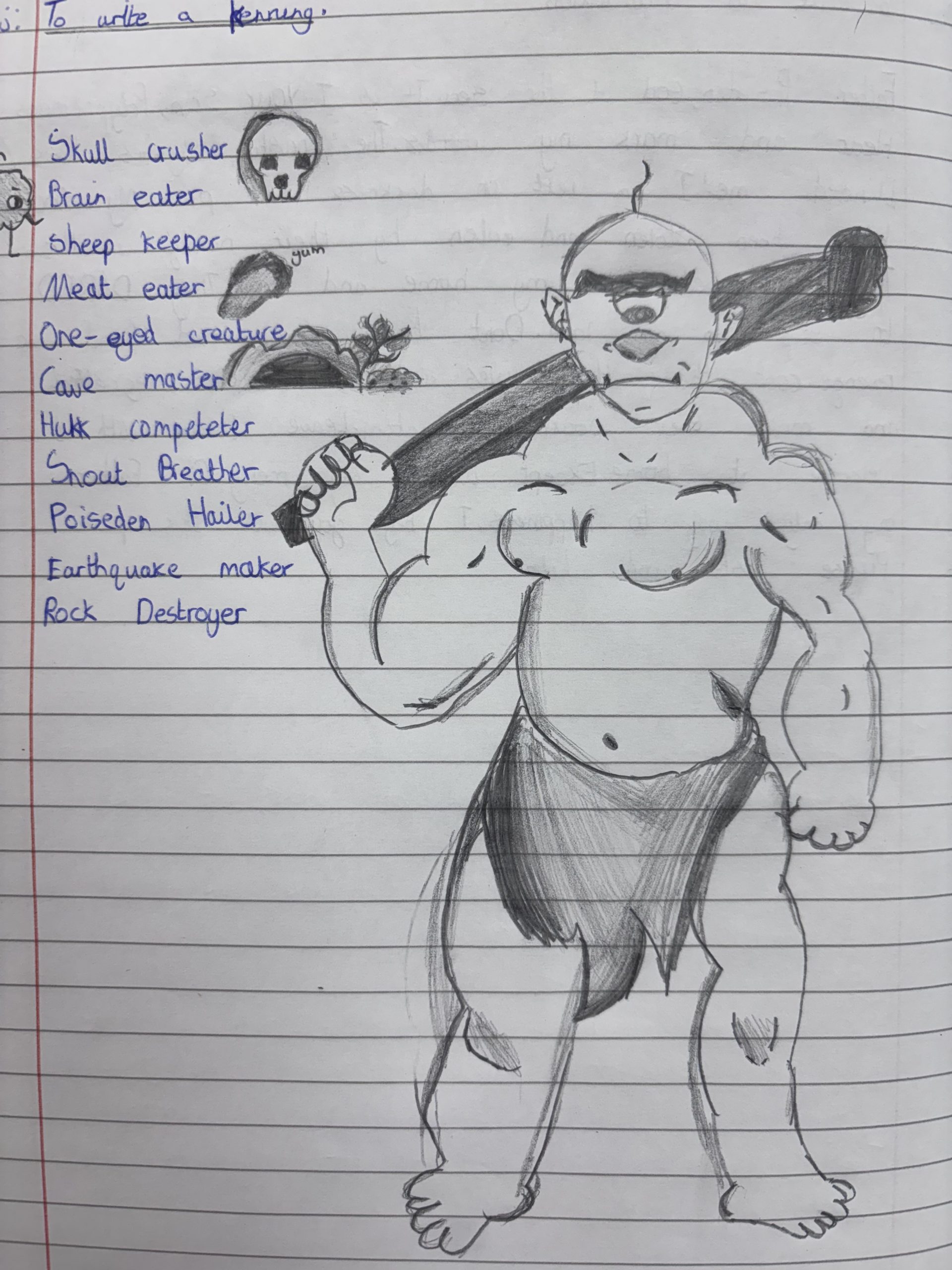 Year 6 had some fun today writing a Kenning for the cyclops character from our class text – Odysseus. And … some wonderful sketches to accompany it too !
