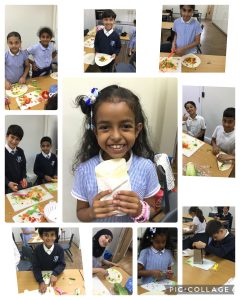 In D.T. we made picnic wraps to as part of the school’s 150 years celebration. We analysed different ingredients and then used our cutting, peeling and grating skills to make our wrap using our favourite.