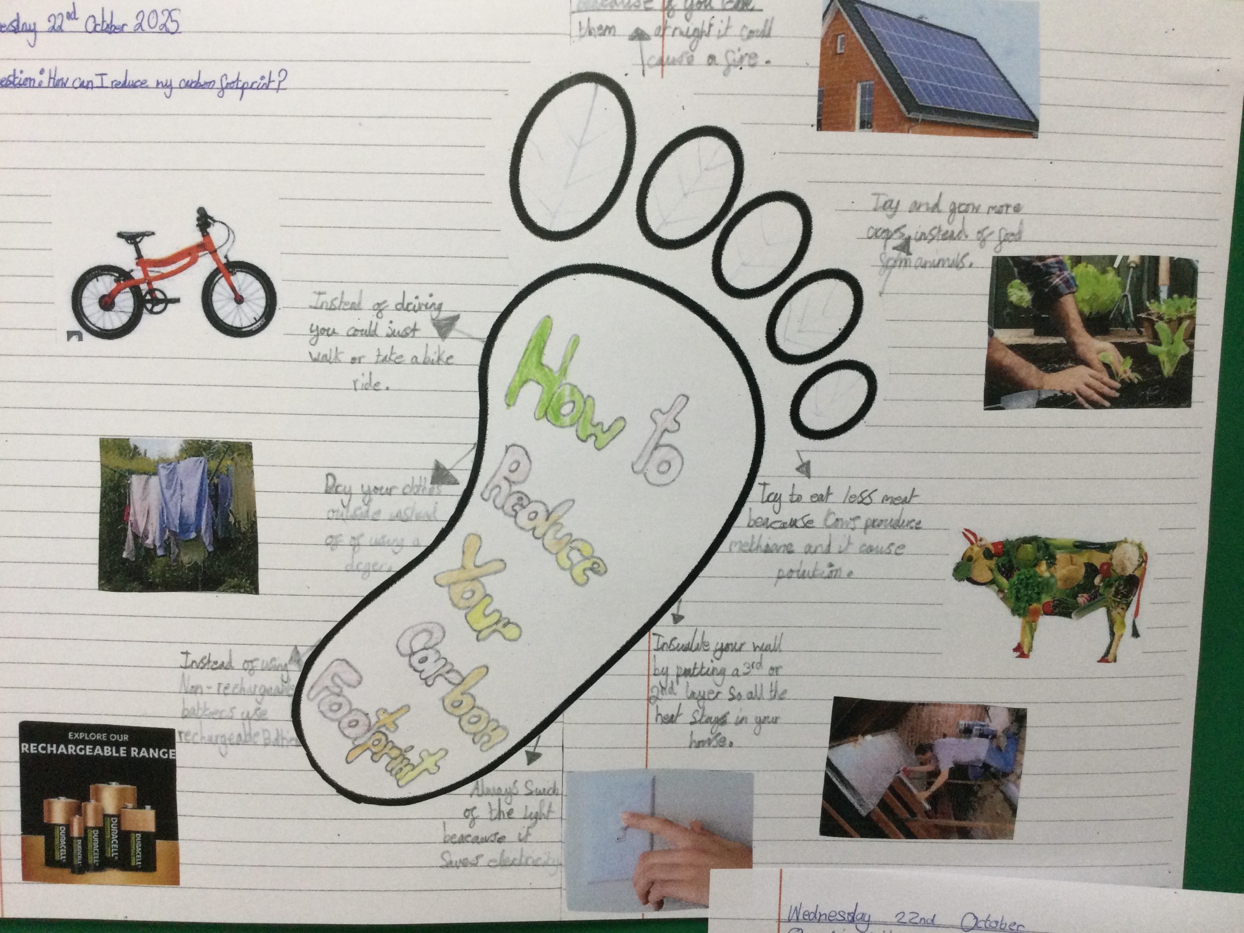 We are finding so much to learn about during this unit in Geography. After finding out about climate change and the causes and effects, we are now making footprints explaining what can be done to reduce our carbon footprints.